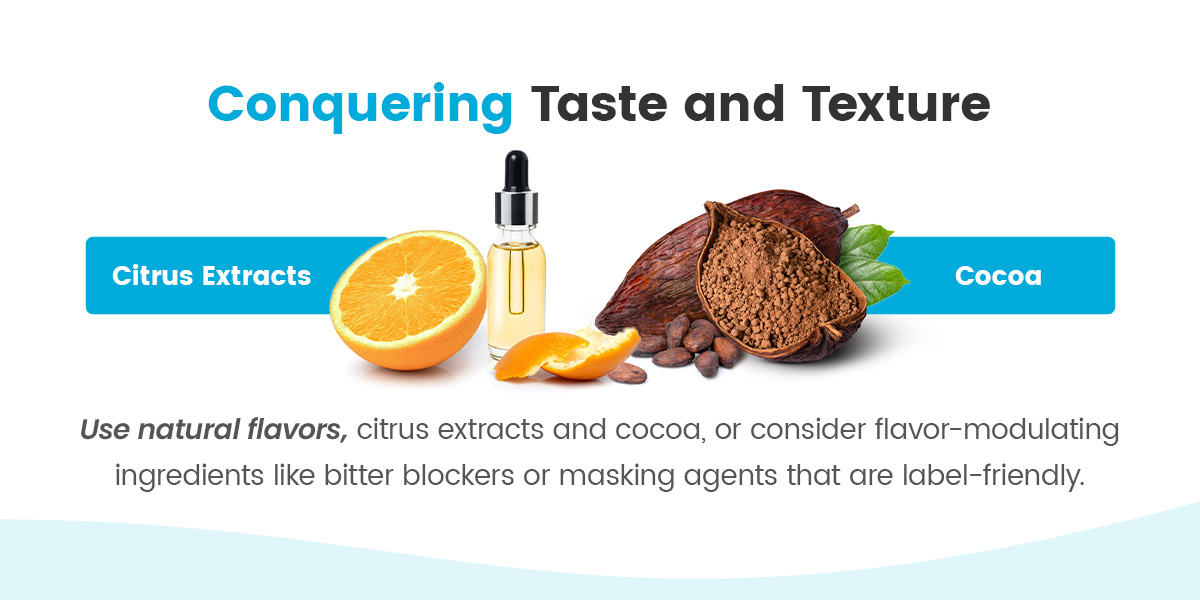 Taste and texture can be challenging, especially with plant-based proteins. To address this, use natural flavors, citrus extracts and cocoa, or consider flavor-modulating ingredients like bitter blockers or masking agents that are label-friendly. Combining plant proteins with milder ones, such as milk with pea or faba bean, helps reduce strong flavor edges.