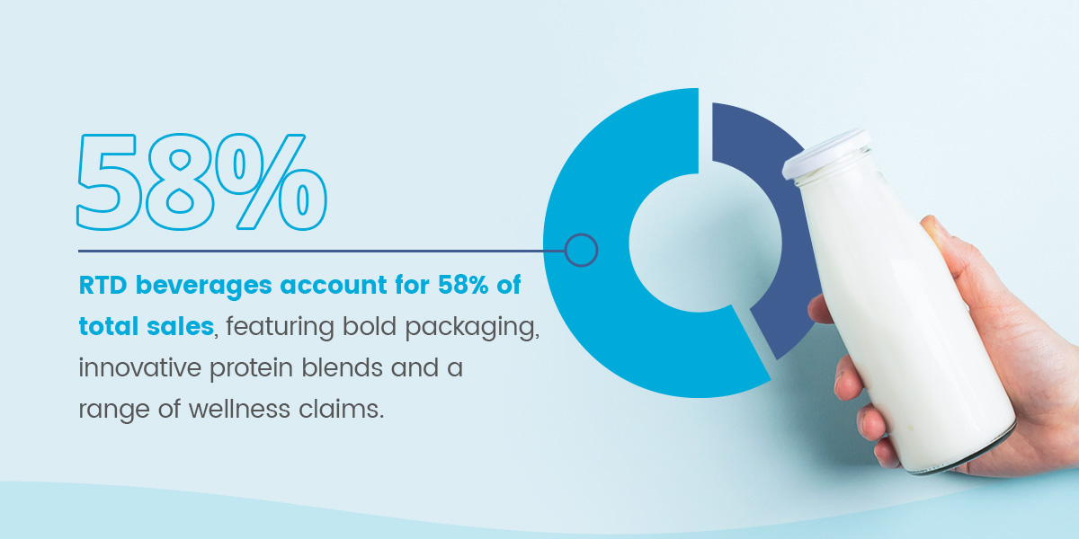 The North American beverage market for protein drinks is increasingly competitive. The protein supplements market size is actively growing, and RTD beverages account for 58% of total sales, featuring bold packaging, innovative protein blends and a range of wellness claims.